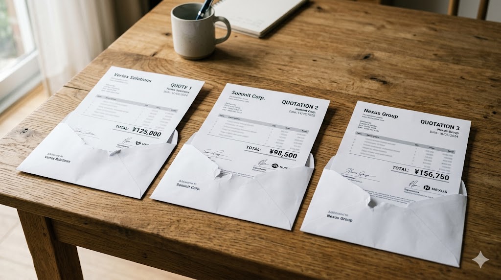 適正価格を知る最も確実な方法は、条件を揃えた上での複数社比較です。しかし自力で条件を揃えた相見積もりを取るのは容易ではありません。業者ごとに見積もりの前提条件が異なると、単純な金額比較ができないのです。